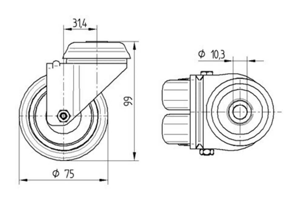 Въртящо се Колело Agila twin е оборудвано с Отвор за болт като тип свързване, осигуряващ надеждно закрепване към различни конструкции. Корпусът е изработен от Стоманен лист, среден и разполага с Две състезания с топка за плавно въртене и дълготрайна работа. Колелото се състои от корпус от Полипропилен с протектор от Термопластичен каучук, който осигурява отлично сцепление и тихо движение, като използва Плъзгащ лагер за ефективна работа. Диаметърът на колелото е 75 mm, а общата височина на конструкцията достига 99 mm. Динамичната товароносимост е 100 kg при скорост до 3 km/h, докато статичната товароносимост е 200 kg. Продуктът е подходящ за Болнични легла за грижа, Колички за кетъринг и системи за доставка на храна, Тролеи за обслужване по време на полет и Магазинно оборудване и дисплеи.