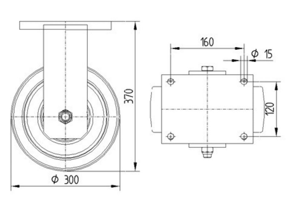 Pevné kolečko Omikron je vybaveno obdélníkovou destičkou pro montáž a robustním pouzdrem vyrobeným z litiny nebo kované litiny, těžká konstrukce. Kolečko má průměr 300 mm s tělem z litiny a běhounem z odlitého polyuretanu, který zajišťuje vynikající odolnost proti opotřebení a tichý chod. Pohon kolečka je realizován prostřednictvím přesného kuličkového ložiska, které garantuje plynulý pohyb a dlouhou životnost. Celková výška kolečka činí 370 mm. Dynamická nosnost dosahuje 3120 kg při rychlosti 4 km/h nebo 2600 kg při rychlosti 6 km/h, zatímco statická nosnost je 6240 kg. Toto kolečko je ideální pro těžké průmyslové aplikace vyžadující vysokou spolehlivost a nosnost.