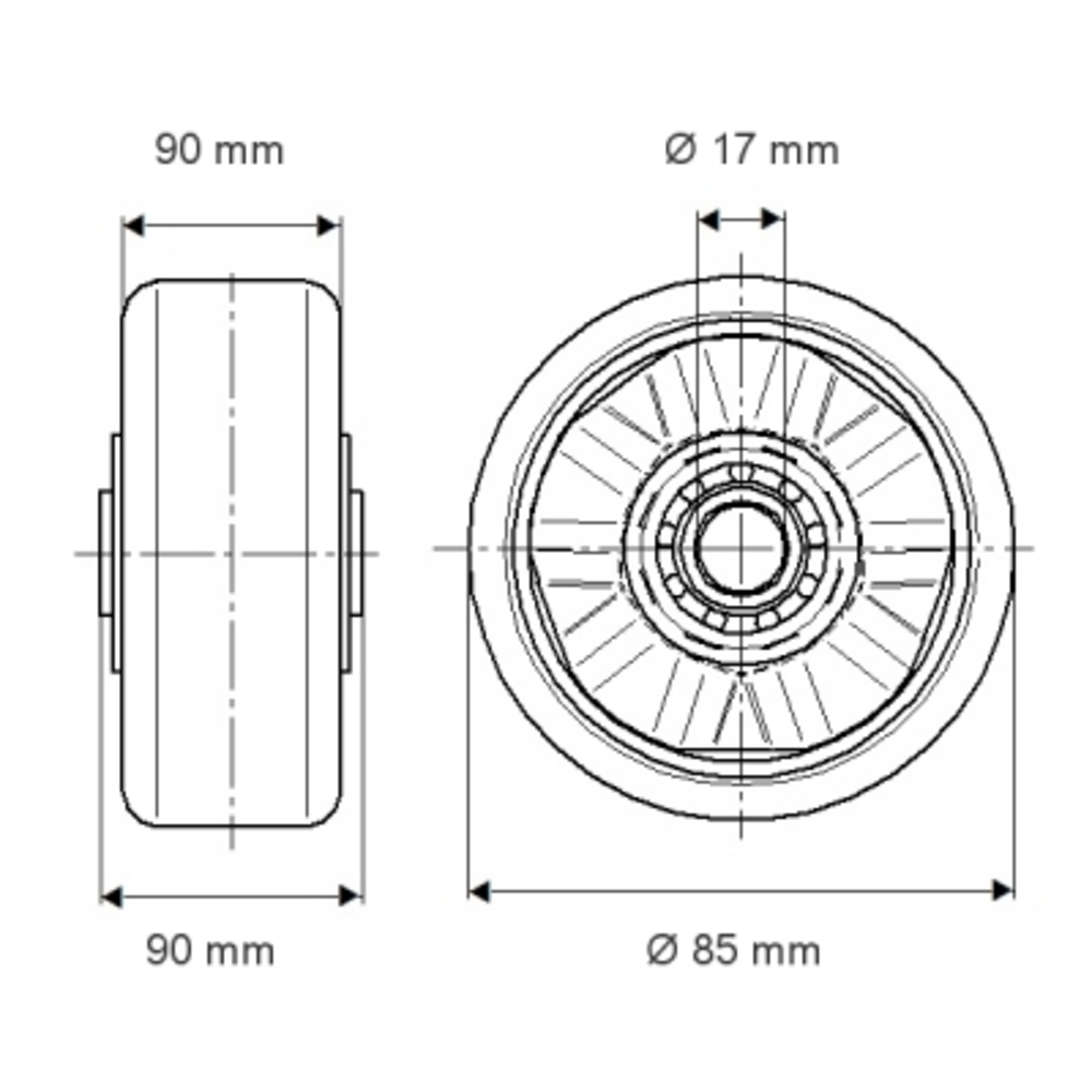 Das Novatech Rad verfügt über einen Durchmesser von 85 mm und eine Laufflächenbreite von 90 mm aus gegossenem Polyurethan. Der R...