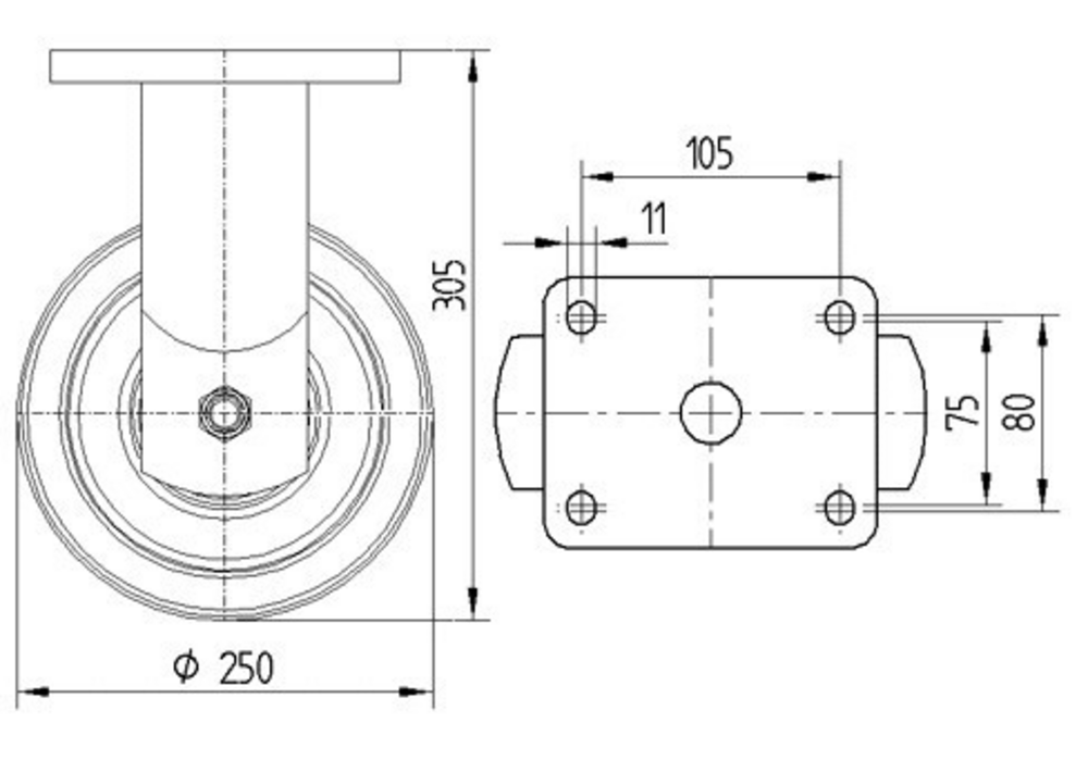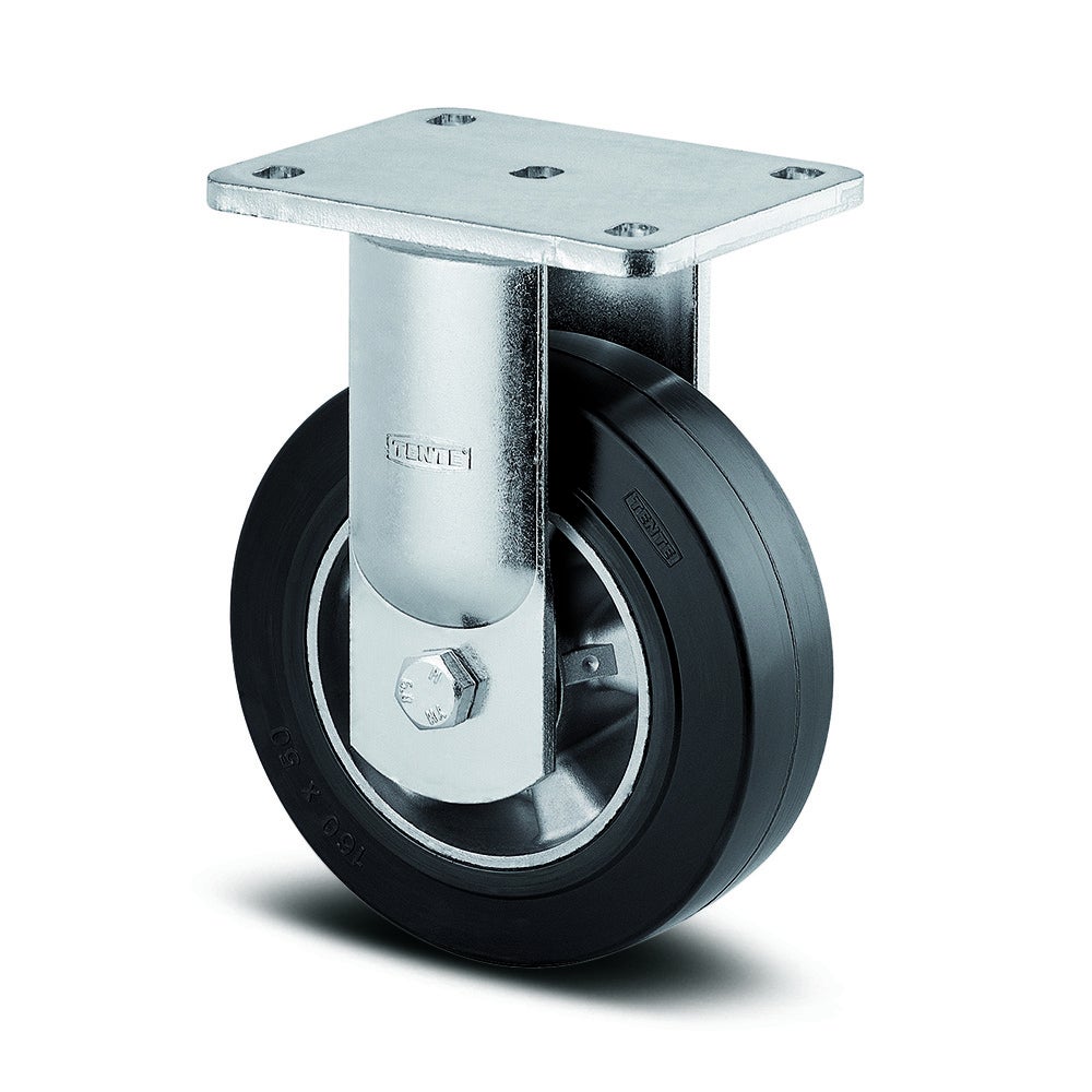 Die Bockrolle Kappa ist mit einer mittelgroßen rechteckigen Platte als Befestigung ausgestattet und verfügt über ein Gehäuse aus Schmiedeeisen, schwer. Das Rad besteht aus einem Aluminiumkörper mit Elastikreifen, schwarz, vulkanisiert als Lauffläche und ist mit Präzisionskugellagern gelagert. Der Raddurchmesser beträgt 250 mm bei einer Gesamthöhe von 305 mm. Die dynamische Tragfähigkeit liegt bei 500 kg bei 4 km/h und 400 kg bei 6 km/h, während die statische Tragfähigkeit 1000 kg erreicht. Diese Rolle eignet sich für anspruchsvolle Anwendungen in der Luft- und Raumfahrtindustrie, Flughafenausrüstung, AMR-Systeme, Automobil-OEM, Keramik- und Glashersteller, Produktions- und Plattformwagen sowie schwere AGV-Systeme.