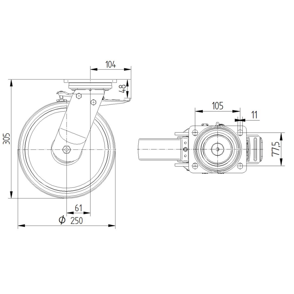 Die Lenkrolle mit Totalfeststeller, vorlaufend Kappa ist mit einer mittelgroßen rechteckigen Platte ausgestattet. Das Gehäuse besteht aus Schmiedeeisen, schwer und verfügt über ein Kugelbahn, zweireihig, verstärkt oder rostfrei Schwenklager. Das Rad mit einem Durchmesser von 250 mm weist einen Radkörper aus Aluminium auf, der mit einem Elastikreifen, schwarz, vulkanisiert versehen ist und über Präzisionskugellager verfügt. Die Gesamthöhe der Rolle beträgt 305 mm. Die dynamische Tragfähigkeit liegt bei 500 kg bei 4 km/h bzw. 400 kg bei 6 km/h, während die statische Tragfähigkeit 1000 kg erreicht. Typische Anwendungsbereiche umfassen Luft- und Raumfahrtindustrie, Flughafenausrüstung, AMR-Systeme, Automobil-OEM, Keramik- und Glashersteller, Produktions- und Plattformwagen sowie schwere AGV-Systeme.