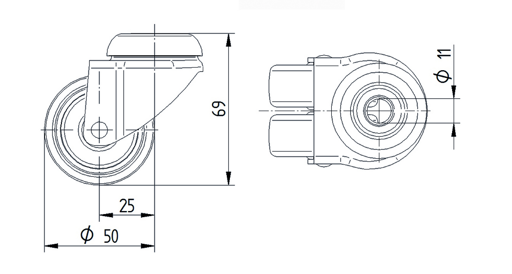 The Agila twin swivel castor features a bolt hole fitting for secure mounting applications. The housing is constructed from medium steel sheet and incorporates two ball races for the swivel bearing mechanism, ensuring smooth directional movement and enhanced durability. The wheel comprises a polyamide body with injected polyurethane tread material, providing excellent floor protection and quiet operation, whilst utilising a plain bearing system for reliable performance. The wheel diameter measures 50mm with an overall height of 69mm, making it suitable for compact applications requiring manoeuvrability. Load specifications include a dynamic capacity of 70kg at speeds up to 3km/h and a static load capacity of 140kg. This castor is specifically designed for care beds, catering carts and meal delivery systems, inflight trolleys, and store fixtures and display applications where reliable mobility and load-bearing performance are essential requirements.