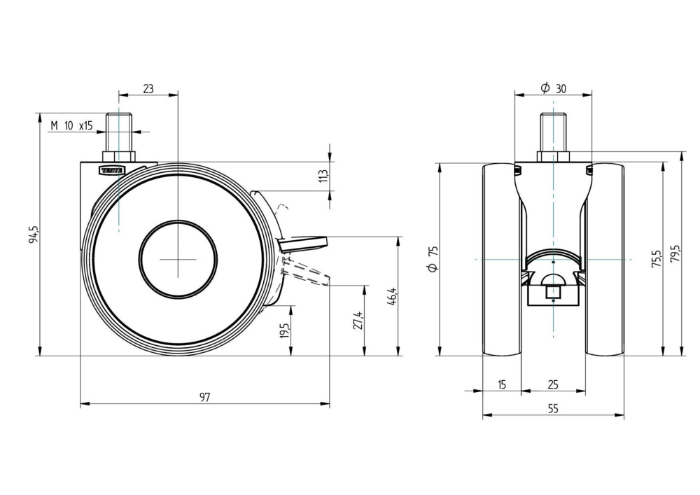 The Linea light swivel castor with wheel brake features a threaded stem with hexagon neck, top fitting for secure mounting applications. The housing is constructed from durable polyamide material and incorporates a stem, swiveling bearing system for smooth directional changes. The wheel assembly consists of a polypropylene body with thermoplastic rubber tread material, providing excellent grip and floor protection, whilst utilising a plain bearing with spacer tube for reliable rotation. The wheel measures 75 mm in diameter, contributing to an overall height of 79.5 mm. Load capacity specifications include a dynamic rating of 30 kg at speeds up to 3 km/h and a static load capacity of 60 kg. This castor is ideally suited for medical equipment including anaesthesia carts, dialysis carts, C-arms, CT scanners, MRI and X-ray equipment, ventilators and ultrasound machines, as well as office furniture, catering carts, computers on wheels, and professional cleaning carts in hospitals and nursing facilities.