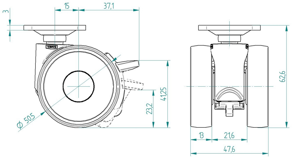 The Linea light swivel castor with wheel brake features a square plate fitting for secure mounting applications. The housing is ...