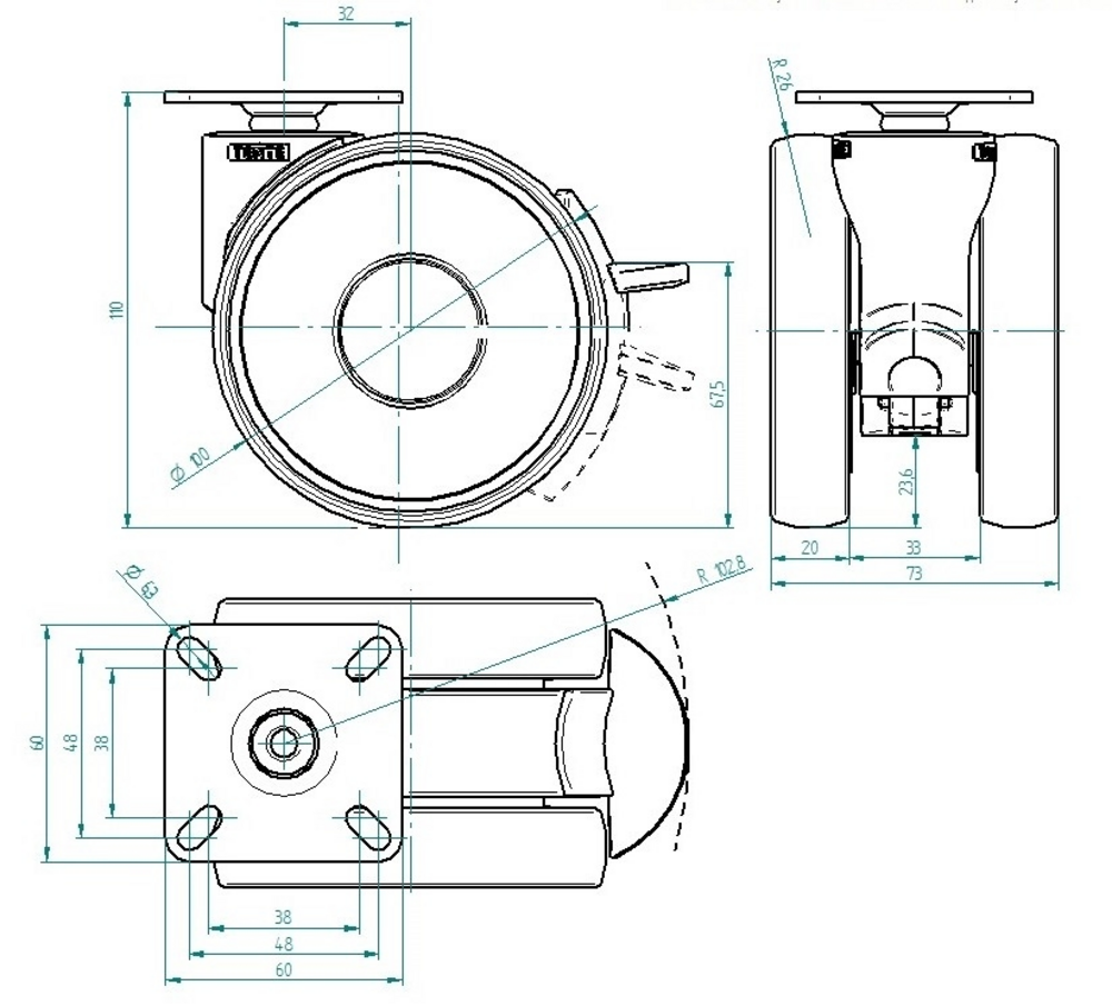 The Linea light swivel castor with wheel brake features a square plate fitting for secure mounting applications. The housing is constructed from durable polyamide material and incorporates a stem, swiveling bearing system for smooth directional changes. The wheel assembly consists of a polyamide body with injected polyurethane tread material, mounted on precision ball bearings for optimal performance and longevity. The wheel diameter measures 100 mm, whilst the overall height of the complete assembly is 100 mm. Load specifications include a dynamic capacity of 100 kg at speeds up to 3 km/h and a static load capacity of 200 kg. This castor is specifically designed for demanding applications including anaesthesia carts, bedside tables, C-arms, CT scanners, MRI and X-ray equipment, catering carts, computers on wheels, dialysis carts, furniture, media furniture, medication carts, nursing carts, office chairs, office furniture, ultrasound equipment, ventilators, and professional cleaning carts across hospitals, nursing homes, and retirement facilities.