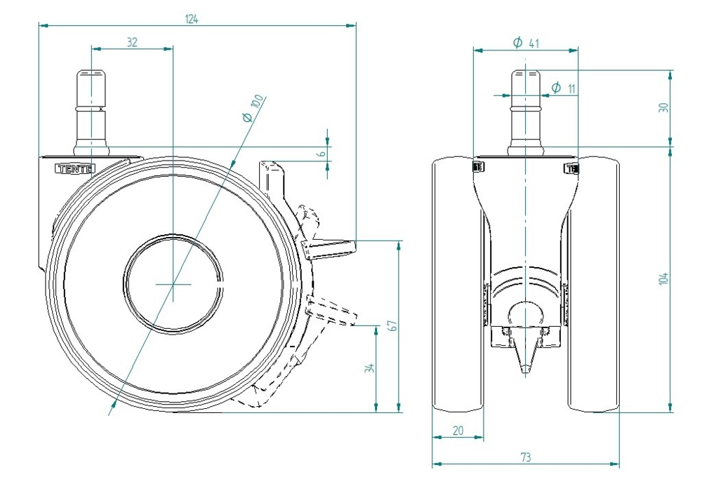 The Linea light swivel castor with wheel brake features a stem with grip ring, with collar fitting system for secure mounting. The housing is constructed from durable polyamide material and incorporates a stem, swiveling bearing mechanism for smooth directional changes. The wheel assembly comprises a polyamide, electric conductive body fitted with an injected polyurethane, electric-conductive tread and precision ball bearing for optimal performance and conductivity. With a wheel diameter of 100 mm, the castor achieves an overall height of 104 mm. Load specifications include a dynamic capacity of 100 kg at speeds up to 3 km/h and a static load capacity of 200 kg, making it suitable for demanding applications including anaesthesia carts, bedside tables, C-arms, CT scanners, MRI, X-ray equipment, catering carts, computers on wheels, dialysis carts, furniture, media furniture, medication carts, nursing carts, office chairs, ultrasound equipment, ventilators, and professional cleaning carts across hospitals, nursing homes, and office environments.