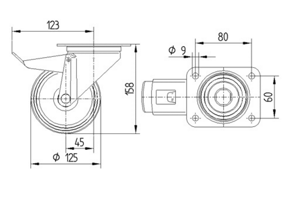 Swivel castor with total lock 125 mm
