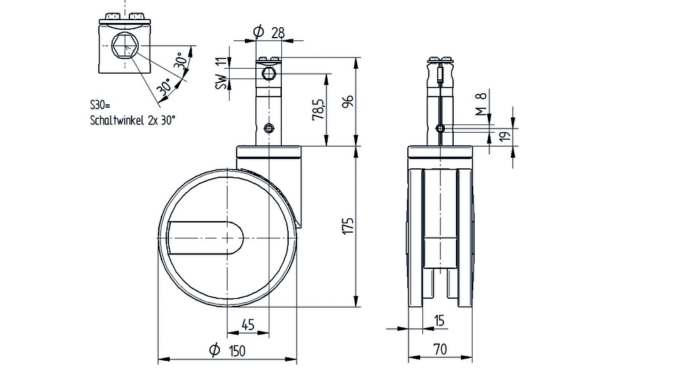 The Integral twin is a swivel castor with central, total or directional lock, featuring a stem with cam hole for profile bars fitting system. The housing is constructed from medium steel sheet and incorporates a precision ball bearing swivel bearing for smooth operation. The wheel comprises a polyamide body with injected polyurethane tread material, supported by precision ball bearing for enhanced durability and performance. With a wheel diameter of 150 mm, the castor has an overall height of 175 mm. The load capacity specifications include a dynamic load rating of 150 kg at speeds of 3 km/h and 150 kg at 4 km/h, whilst providing a static load capacity of 300 kg. This castor is specifically designed for demanding medical applications including anaesthesia carts, C-arms, CT scanners, MRI, X-ray equipment, care beds, hospital beds, surgery robots, surgery tables, and ultrasound devices in hospitals, nursing homes, and retirement facilities.