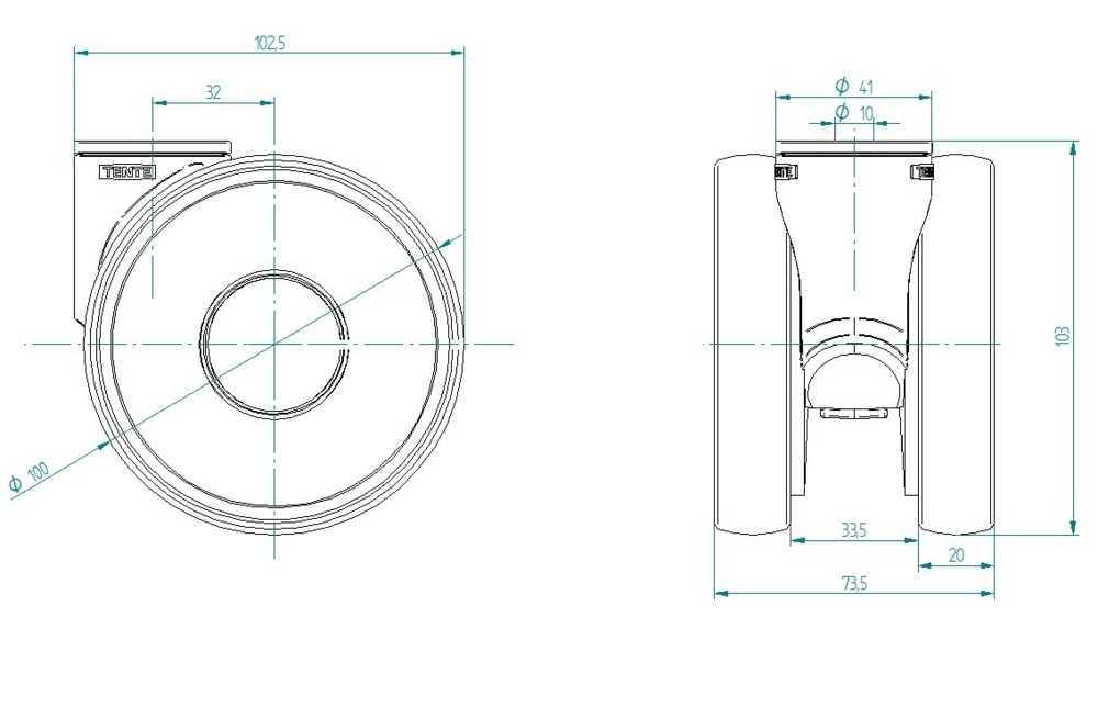 Twin wheel castor for high load capacity and low height.