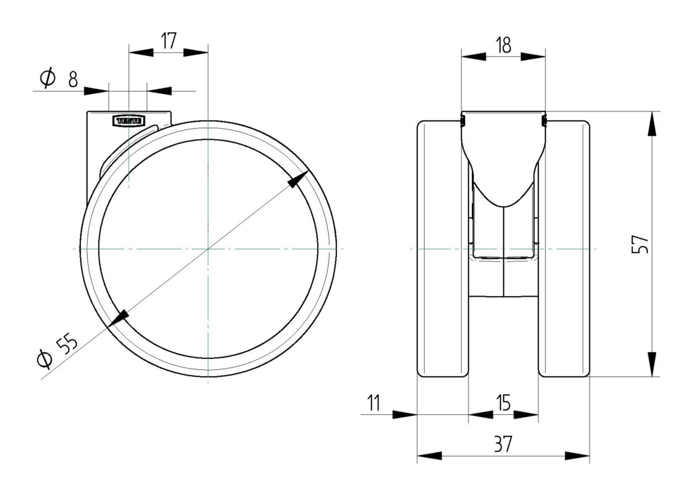 The Stylea swivel castor features a blind hole for B10 fitting system for secure mounting applications. The housing is constructed from durable polyamide material and incorporates a stem, swivelling bearing mechanism that ensures smooth rotational movement. The wheel assembly consists of a 55mm diameter wheel with a polyamide body and identical polyamide tread material, supported by a plain bearing with spacer tube for reliable operation. The castor has an overall height of 57mm, making it suitable for compact installations. Load specifications include a dynamic capacity of 40kg at speeds up to 3km/h and a static load capacity of 80kg. This versatile castor is specifically designed for bedside tables, furniture, media furniture, office chairs, and office furniture applications where reliable mobility and load-bearing performance are essential requirements.