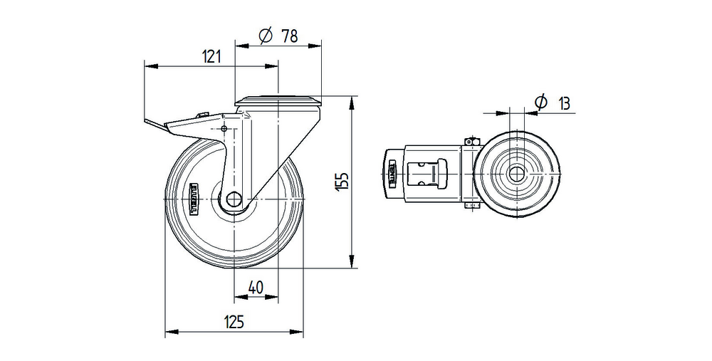 The Alpha swivel castor with total lock and bolt hole fitting features a heavy steel sheet housing and two ball races swivel bearing. The polyamide wheel body has a non-marking, vulcanized elastic tire tread. The wheel uses a roller bearing and has a diameter of 125 mm. The overall height of the castor is 155 mm. At 4 km/h, the Alpha castor has a load capacity of 160 kg. When static, it can support up to 320 kg.