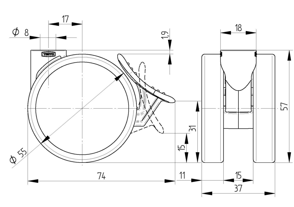 Swivel castor with wheel brake 55 mm