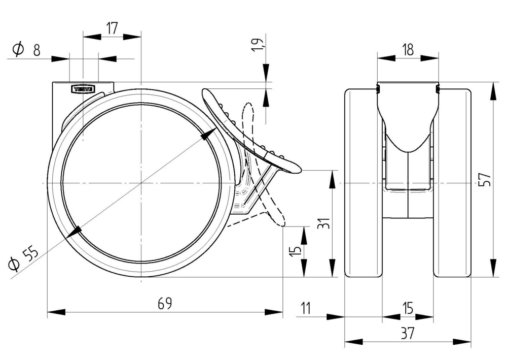 Swivel castor with wheel brake 55 mm