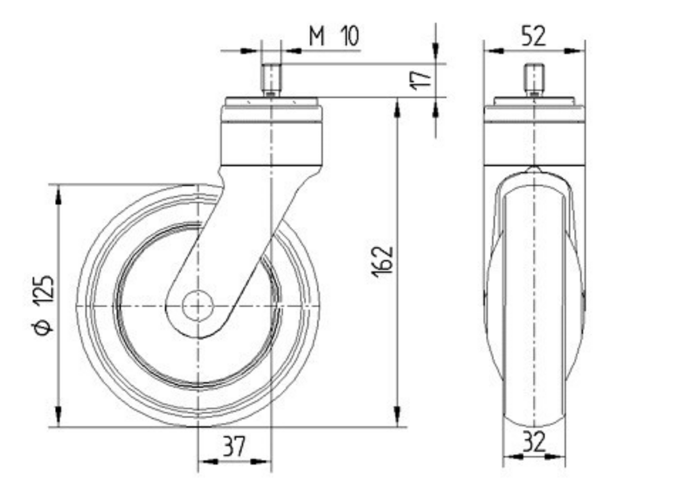The ICS swivel castor features a threaded stem with hexagon neck, top fitting for secure mounting applications. The housing is constructed from durable polyamide material and incorporates a stem, swiveling bearing system that enables smooth directional changes under load. The wheel assembly comprises a polyamide, electric conductive body fitted with an injected polyurethane, electric-conductive tread that provides excellent grip whilst maintaining electrical conductivity throughout operation. The wheel runs on precision ball bearing, sealed units that ensure reliable performance and extended service life. With a wheel diameter of 125 mm and an overall height of 162 mm, this castor offers compact dimensions suitable for space-constrained installations. The dynamic load capacity reaches 100 kg at speeds up to 3 km/h, whilst the static load capacity extends to 200 kg, making it ideal for care beds and similar healthcare applications requiring both mobility and electrical safety.