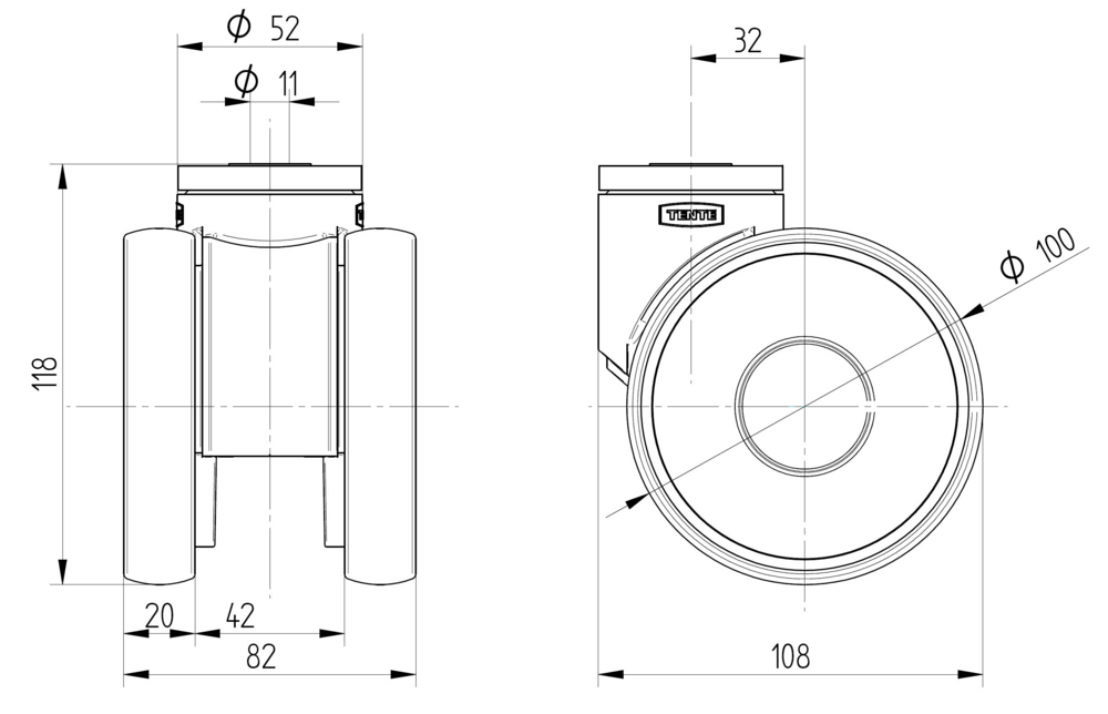 Twin wheel castor with high manoeuvrability due to differential effect.
