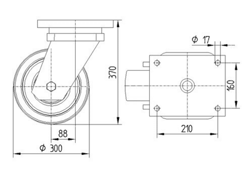 The Omikron swivel castor features a large rectangular heavy-duty plate fitting designed for demanding industrial applications. The housing is constructed from iron forged, heavy material and incorporates a deep-groove ball thrust roller bearing swivel mechanism for smooth directional changes under load. The wheel assembly comprises a sheet steel, heavy body fitted with a polyurethane, casted tread and precision ball bearing for optimal performance, with a diameter of 300 mm. The castor has an overall height of 370 mm, making it suitable for heavy-duty equipment. Load capacity specifications include a static load rating of 6240 kg, whilst dynamic load capacity varies with operating speed: 3120 kg at 4 km/h and 2600 kg at 6 km/h. This robust castor is specifically engineered for airport equipment and AGV systems where reliability and high load-bearing capacity are essential requirements.