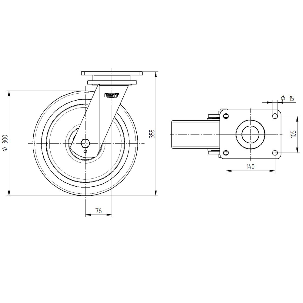 The Kappa load swivel castor features a large rectangular plate fitting for secure mounting applications. The housing is constructed from iron forged, heavy material and incorporates a deep-groove ball thrust roller bearing swivel mechanism for smooth directional changes under load. The wheel assembly comprises a cast iron body with polyurethane, casted tread material, mounted on precision ball bearings for optimal rolling performance. The wheel diameter measures 300 mm with an overall height of 355 mm. Load capacity specifications include dynamic ratings of 2400 kg at 4 km/h and 2000 kg at 6 km/h operating speeds, whilst the static load capacity reaches 4000 kg. This heavy-duty castor is engineered for demanding applications including airport equipment, AMR systems, automotive OEM, ceramic and glass manufacturers, production and platform trolleys, and AGV systems.