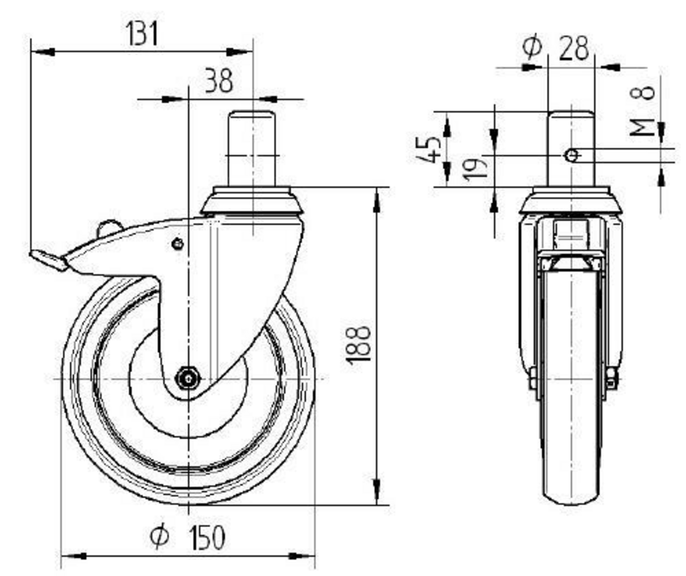 Swivel castor with total lock 150 mm