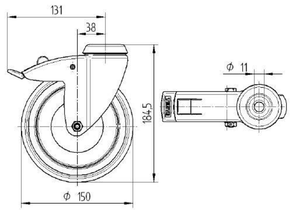The Agila swivel castor with total lock features a bolt hole fitting system that allows castors to be mounted with standard screws of any length. The housing is constructed from medium steel sheet and incorporates two ball races for the swivel bearing mechanism. The wheel comprises a polyamide, electric conductive body with an injected polyurethane, electric-conductive tread and precision ball bearing for smooth operation. With a wheel diameter of 150 mm, the castor has an overall height of 185 mm. The unit provides a dynamic load capacity of 100 kg at speeds up to 3 km/h and a static load capacity of 200 kg, making it suitable for applications including care beds, catering carts and meal delivery systems, hospitals, nursing and retirement homes, professional cleaning carts, and store fixtures and display equipment.