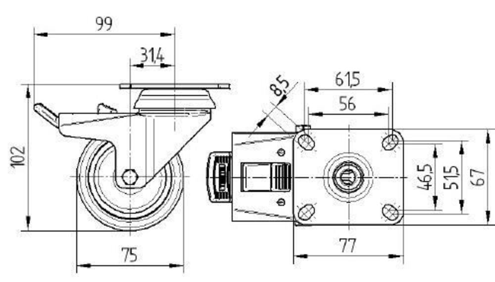 Swivel castor with total lock 75 mm