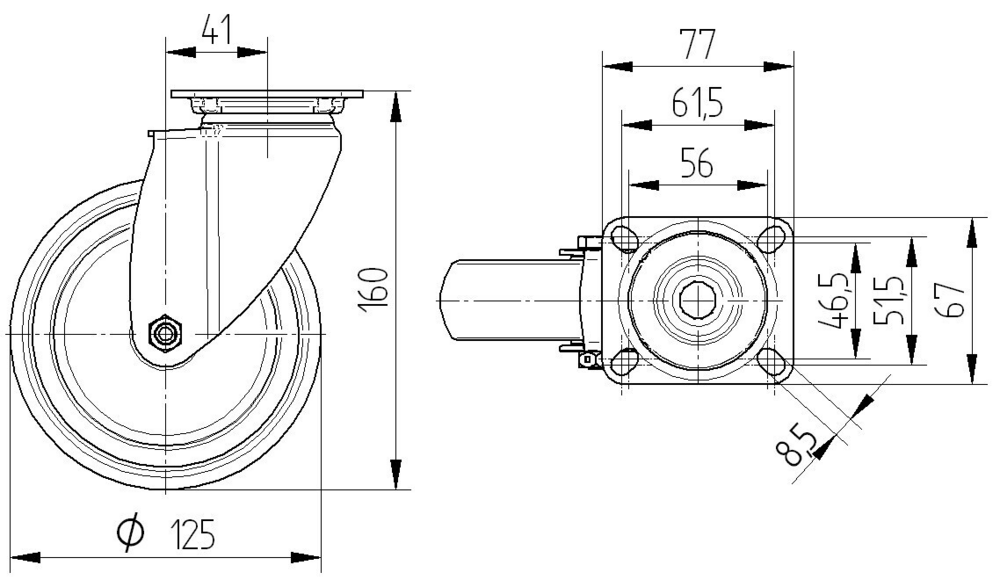The Agila stainless swivel castor features a rectangular plate fitting for secure mounting applications. The housing is constructed from medium-grade stainless steel and incorporates a robust two ball races swivel bearing system for smooth directional movement. The wheel comprises a polypropylene body with thermoplastic rubber tread material, providing excellent grip and floor protection, whilst utilising a plain bearing for reliable rotation. The wheel diameter measures 125 mm, contributing to an overall height of 160 mm. Load specifications include a dynamic capacity of 100 kg at speeds up to 3 km/h and a static load capacity of 200 kg. This castor is specifically designed for demanding applications including catering carts and meal delivery systems, as well as professional cleaning carts where hygiene and durability are paramount.