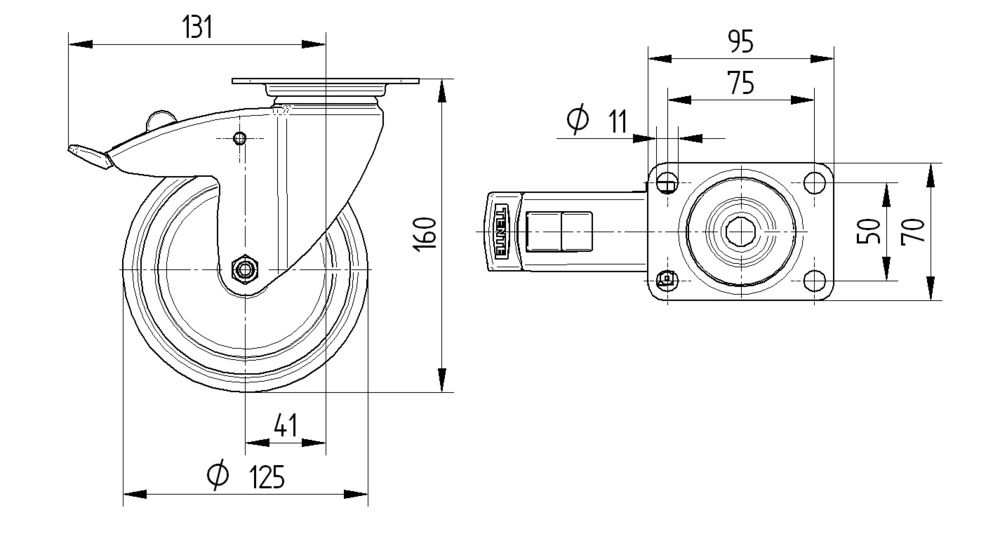 The Agila stainless swivel castor with total lock features a rectangular plate fitting for secure mounting applications. The housing is constructed from medium-grade stainless steel and incorporates two ball races for the swivel bearing mechanism, ensuring smooth directional movement and enhanced durability. The wheel comprises a polypropylene body with thermoplastic rubber tread material, providing excellent grip and floor protection, whilst utilising a plain bearing system for reliable rotation. With a wheel diameter of 125 mm, the castor achieves an overall height of 160 mm. Load specifications include a dynamic capacity of 100 kg at speeds up to 3 km/h and a static load capacity of 200 kg. This castor is specifically designed for demanding applications including catering carts and meal delivery systems, as well as professional cleaning carts where mobility, hygiene, and reliability are essential requirements.
