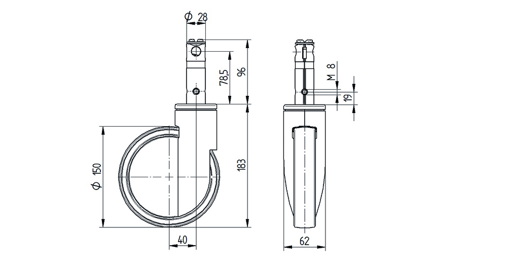 The Integral swivel castor with central, total or directional lock features a stem with cam hole for profile bars fitting, with washable beds requiring sealing in the fitting area by the hospital bed manufacturer. The housing is constructed from medium steel sheet and incorporates a precision ball bearing swivel bearing for smooth operation. The wheel comprises a polyamide, electric conductive body with polyurethane, injected, electric-conductive tread material, supported by sealed precision ball bearings. With a wheel diameter of 150 mm, the castor has an overall height of 183 mm. Load capacity specifications include dynamic loads of 150 kg at speeds of 3 km/h and 150 kg at 4 km/h, with a static load capacity of 300 kg. This castor is designed for demanding medical applications including anaesthesia carts, C-arms, CT scanners, MRI, X-ray equipment, care beds, dialysis carts, hospital beds, hospitals, nursing and retirement homes, stretchers, and ultrasound equipment.