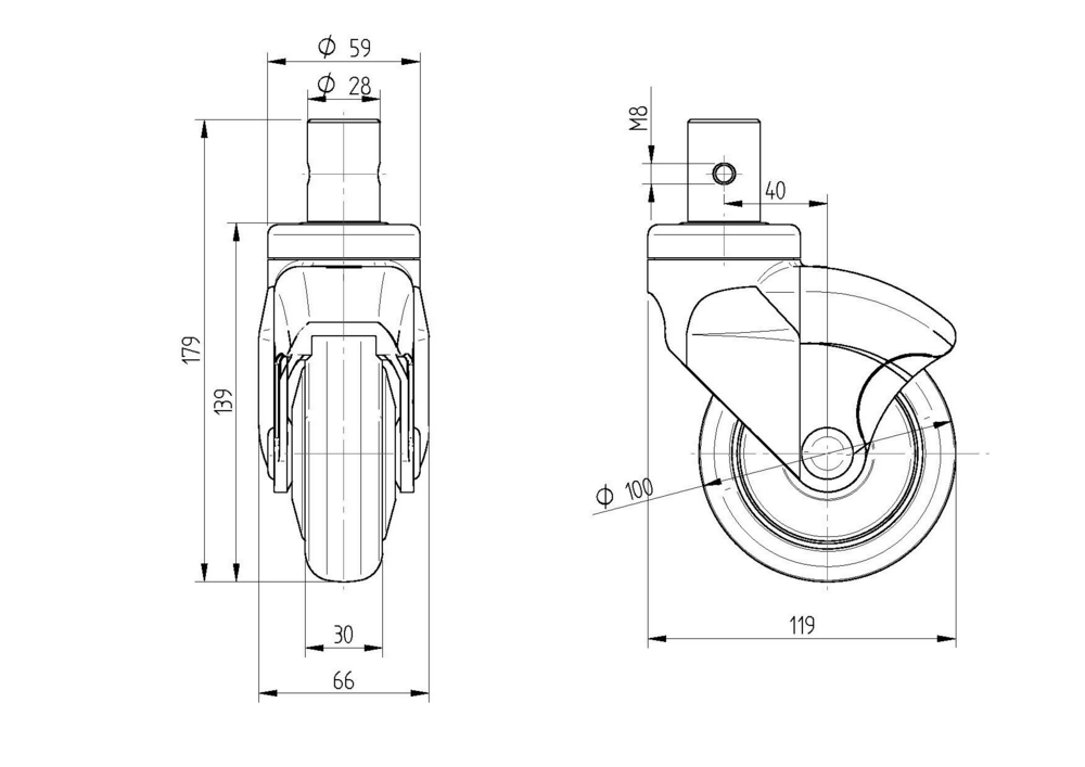 The Galea stainless swivel castor features a solid stem, round fitting for secure mounting applications. The housing is constructed from durable polyamide material and incorporates two ball races, reinforced or stainless swivel bearing system for smooth rotational movement. The wheel assembly comprises a polypropylene body with thermoplastic rubber tread material, providing excellent grip and floor protection, whilst the precision ball bearing, stainless ensures reliable performance and longevity. With a wheel diameter of 100 mm, the castor has an overall height of 139 mm. Load specifications include a dynamic capacity of 100 kg at speeds up to 3 km/h and a static load capacity of 200 kg. This castor is specifically designed for demanding applications including catering carts and meal delivery systems, as well as shower chairs where hygiene and reliability are paramount.