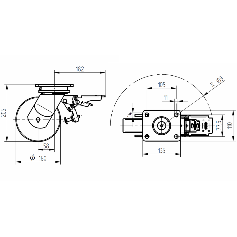 Swivel castor with total lock, head end of castor 160 mm