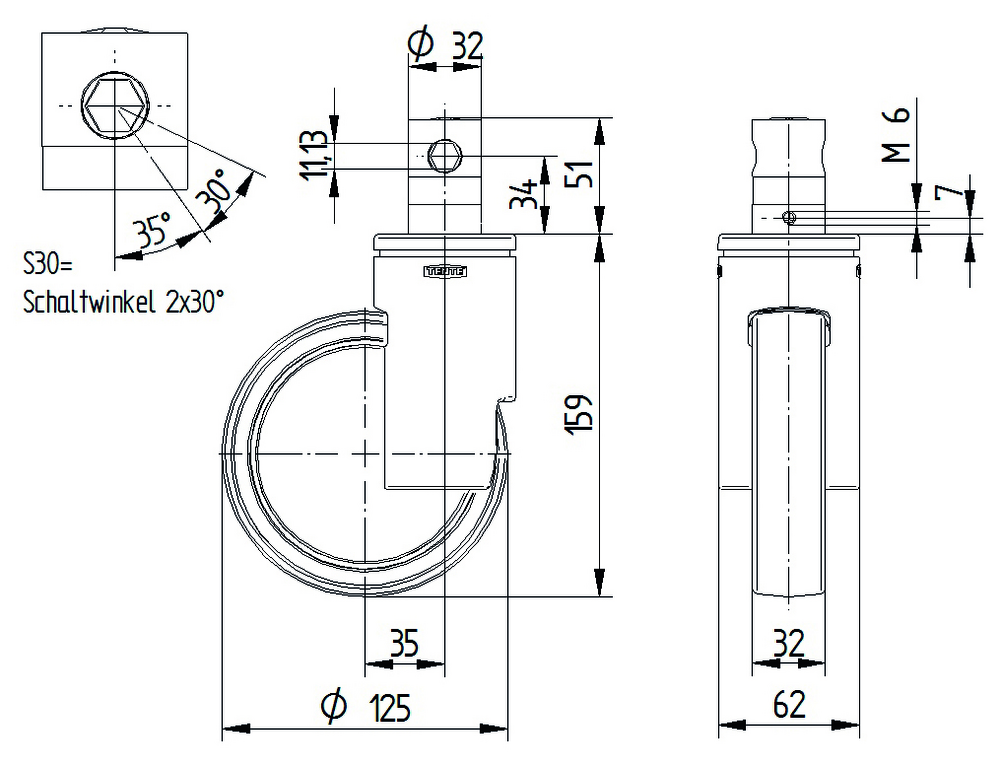 The Integral smart is a swivel castor with central, total or directional lock, featuring a stem with cam hole for profile bars, short version fitting. The housing is constructed from steel sheet, light material and incorporates a precision ball bearing swivel bearing system for smooth operation. The wheel comprises a polyamide body with polyurethane, injected tread material, supported by precision ball bearing for enhanced durability and performance. With a wheel diameter of 125 mm, the castor has an overall height of 158 mm. The load capacity specifications include a dynamic load rating of 135 kg at 3 km/h and 135 kg at 4 km/h operating speeds, whilst providing a static load capacity of 270 kg. This castor is specifically designed for demanding medical applications including anaesthesia carts, C-arms, CT scanners, MRI, X-ray equipment, dialysis carts, hospital beds, hospitals, nursing and retirement homes, and ultrasound equipment.
