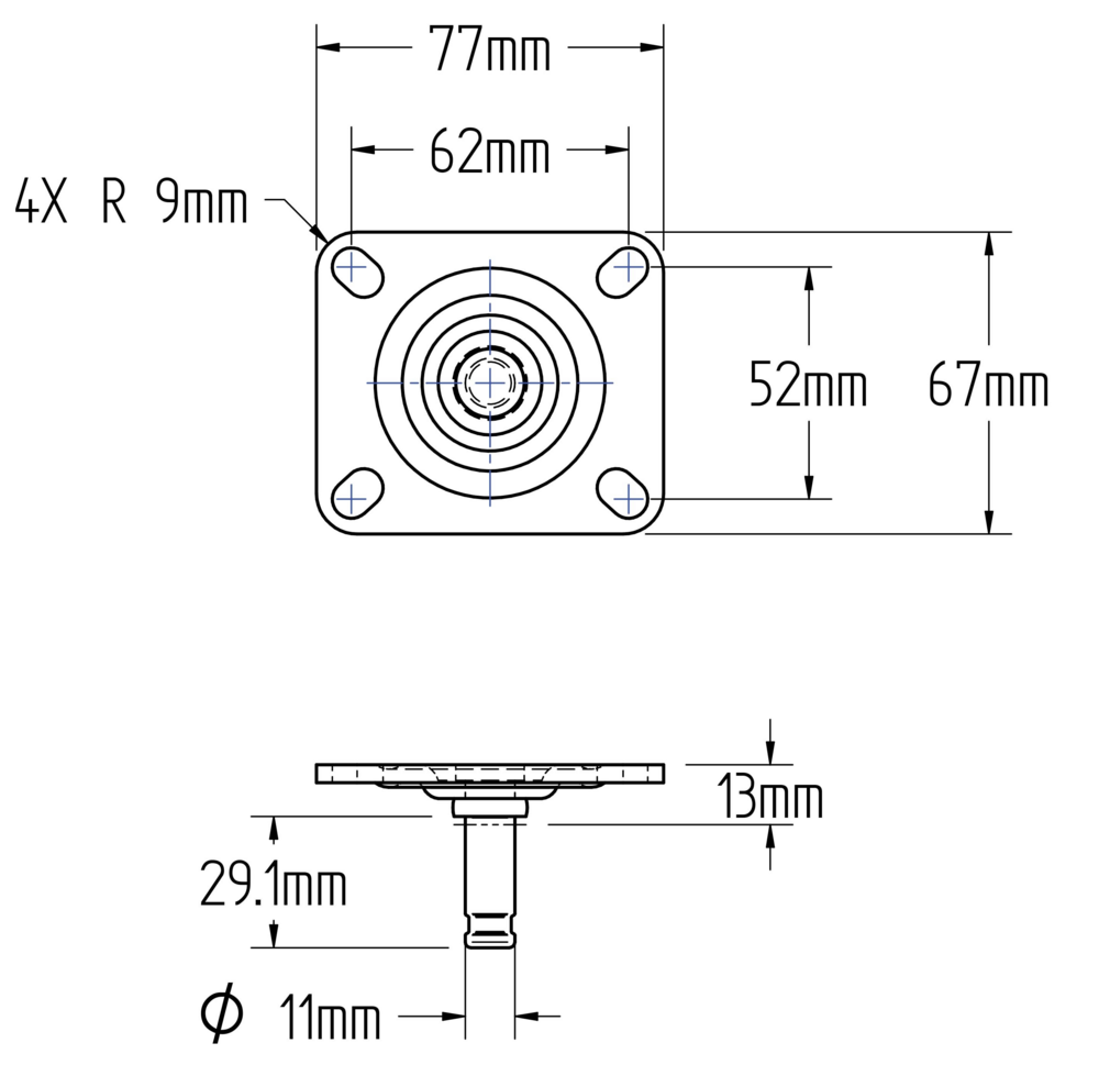 The Levina accessory features a rectangular plate fitting designed to enhance castor functionality and mounting versatility. The rectangular plate measures 77 mm in length and 67 mm in width, providing a stable and secure mounting surface for various industrial applications. This precision-engineered component ensures reliable attachment and optimal load distribution across the mounting interface.