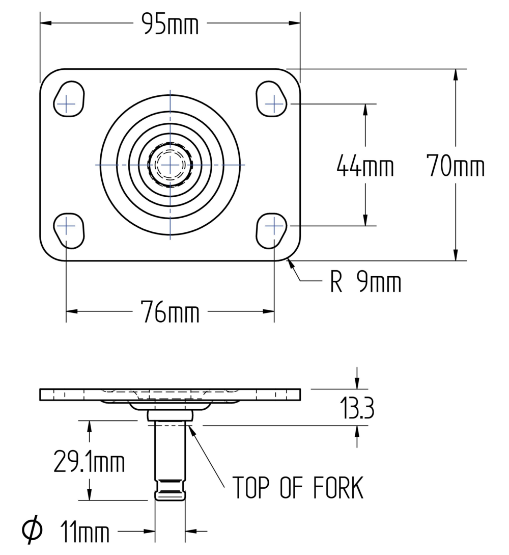 The Levina accessory features a rectangular plate with US-bolt hole spacing designed for castor applications. The mounting plate measures 95 mm in length and 70 mm in width, providing a standardised interface for secure attachment. This accessory component utilises the American bolt hole pattern configuration, ensuring compatibility with US-standard mounting systems whilst maintaining precise dimensional specifications for reliable mechanical connection in industrial castor assemblies.