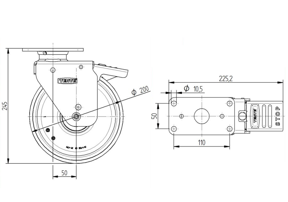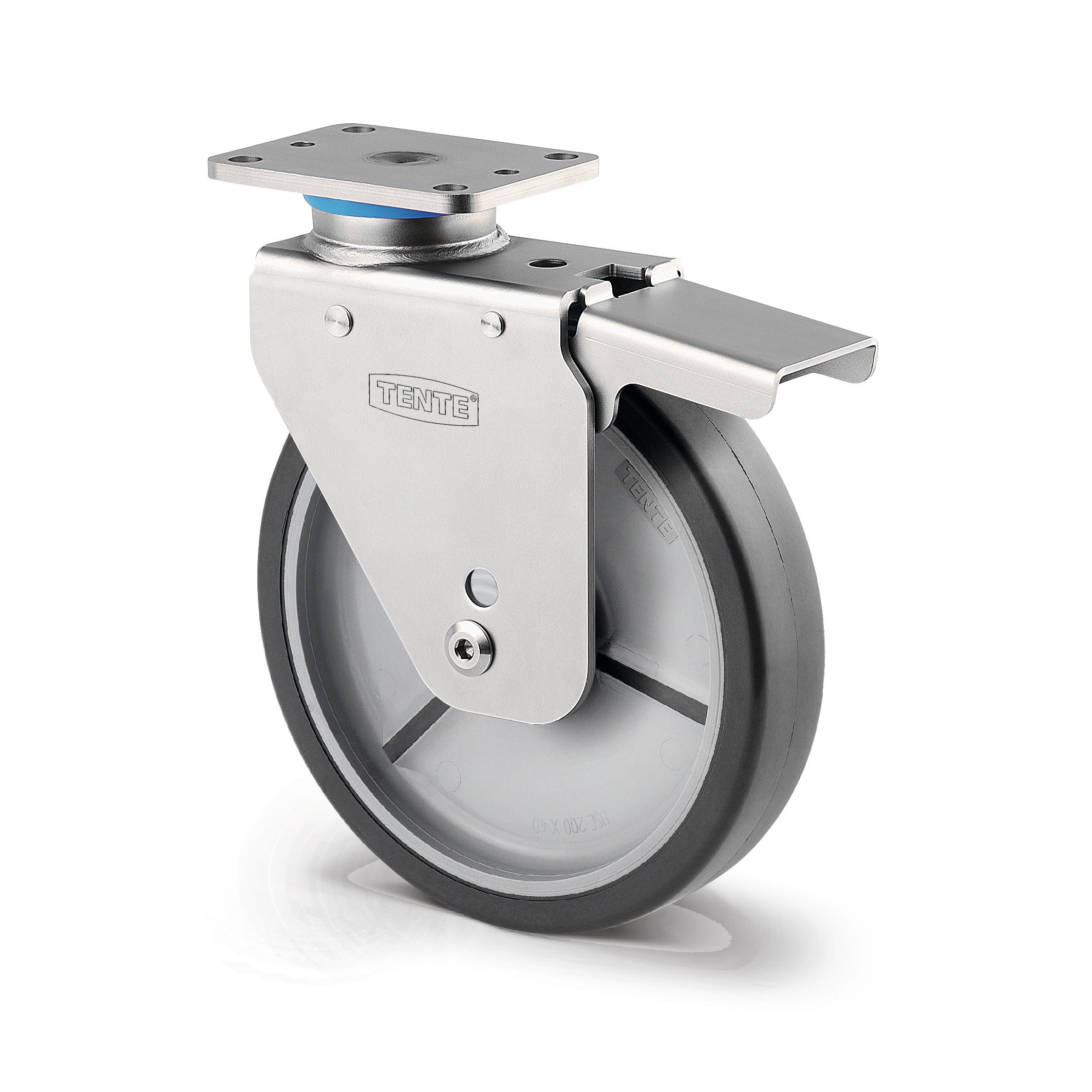Swivel castor with spring loaded directional lock and wheel brake 200 mm