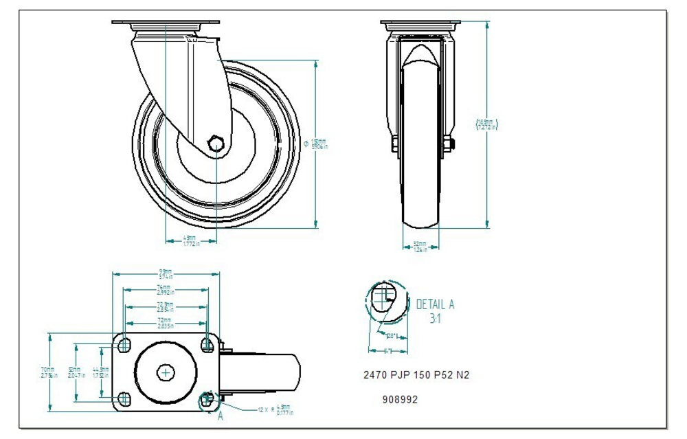 The Agila swivel caster features a rectangular plate fitting with US-bolt hole spacing for standardized mounting applications. The housing is constructed from medium-grade steel sheet and incorporates a dual ball race swivel bearing system for smooth directional movement and enhanced durability. The wheel assembly consists of a polypropylene body with thermoplastic rubber tread material, mounted on precision ball bearings for optimal rolling performance. The wheel measures 5.91 inches in diameter. Overall caster height is 7.28 inches from mounting surface to top. Load specifications include a dynamic capacity of 220.46 pounds at speeds up to 1.86 mph, with a static load rating of 440.92 pounds. This caster is engineered for medium-duty applications requiring reliable mobility and directional control in industrial and commercial environments.