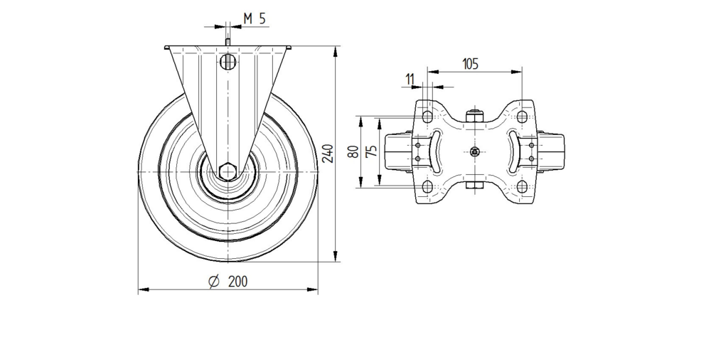 The Alpha safety automatic locking system features a plate with central locking fitting for secure installation. The housing is constructed from heavy stainless steel with a fixed housing swivel bearing configuration, providing robust durability and stability. The wheel incorporates a polyamide body fitted with an elastic tyre that is non-marking and vulcanised, mounted on precision ball bearings that are sealed for reliable performance. The wheel diameter measures 200mm, whilst the overall height of the unit is 240mm. Load specifications include a dynamic capacity of 350kg at speeds up to 4km/h and a static load capacity of 700kg. This versatile castor is suitable for demanding applications including automotive OEM, container construction, fire fighting technology and fire protection, machine construction, post logistic systems, production and platform trolleys, tool cabinets, waste disposal equipment, work benches, and transport equipment.