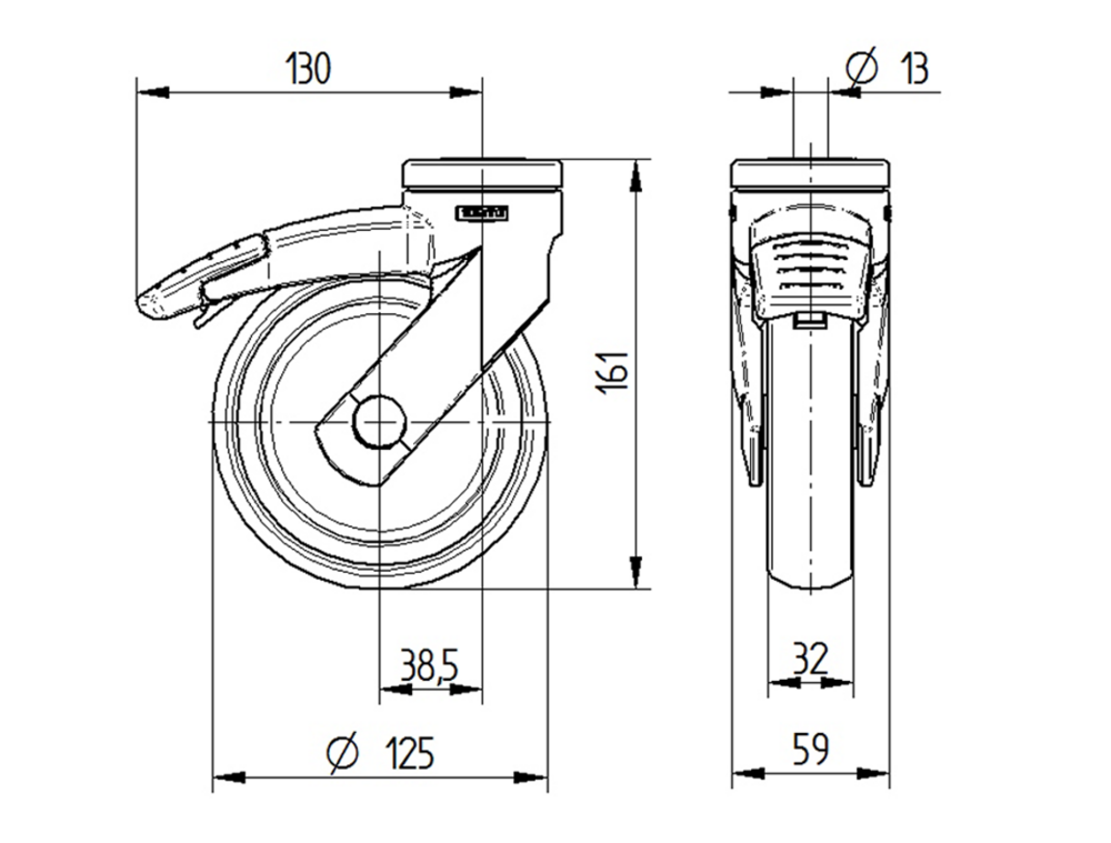 The Levina swivel castor with directional lock features a bolt hole fitting and a housing made of polyamide. It has two ball races for the swivel bearing that allows the wheel to rotate 360 degrees. The wheel body is made of polypropylene with a solid rubber non-marking tread. The wheel uses a plain bearing and has a diameter of 125 mm. The overall height of the castor is 161 mm. At a speed of 3 km/h, the Levina castor has a load capacity of 80 kg. Under static load conditions, it can support up to 160 kg.