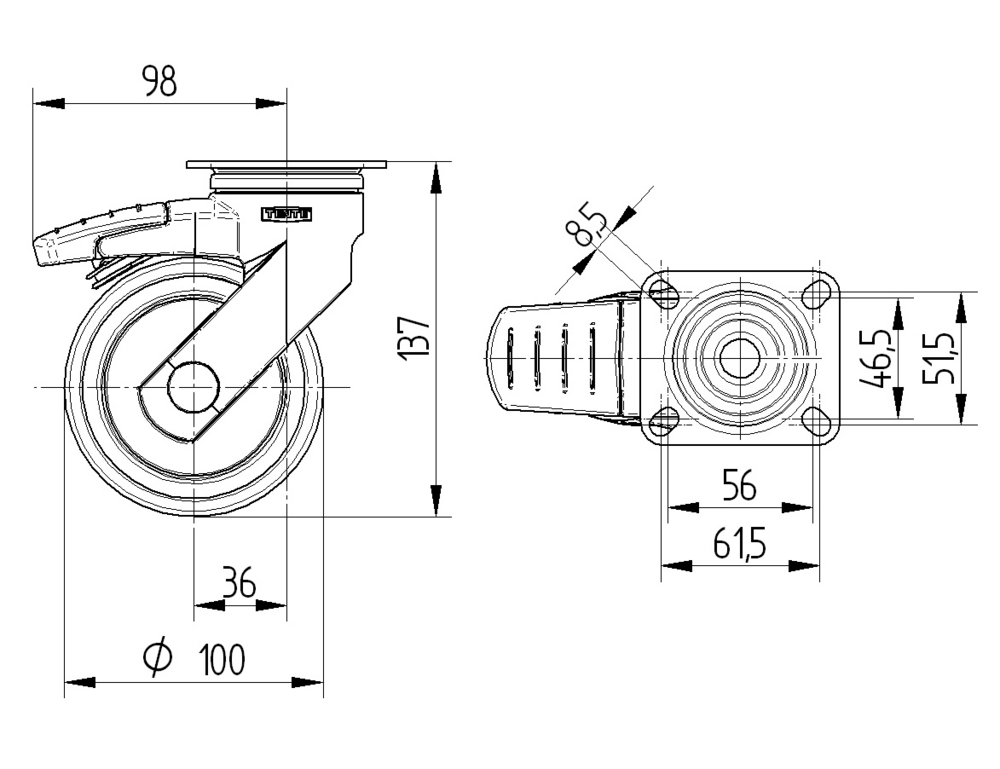 The Levina swivel castor with total lock features a rectangular plate fitting for secure mounting to equipment bases. The housin...