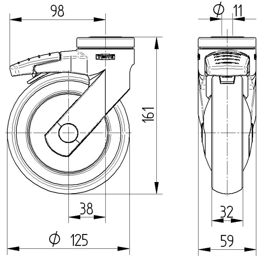 The Levina swivel castor with total lock features a bolt hole fitting for secure mounting applications. The housing is constructed from durable polyamide material and incorporates two ball races for the swivel bearing mechanism, ensuring smooth rotational movement and reliable locking functionality. The wheel assembly comprises a polypropylene body with thermoplastic rubber tread material, providing excellent floor protection and quiet operation, whilst the precision ball bearing ensures optimal rolling performance with a wheel diameter of 125 mm. The castor has an overall height of 161 mm, making it suitable for various equipment configurations. Load specifications include a dynamic capacity of 100 kg at speeds up to 3 km/h and a static load capacity of 200 kg, making it ideal for medical equipment, catering systems, and professional cleaning applications.