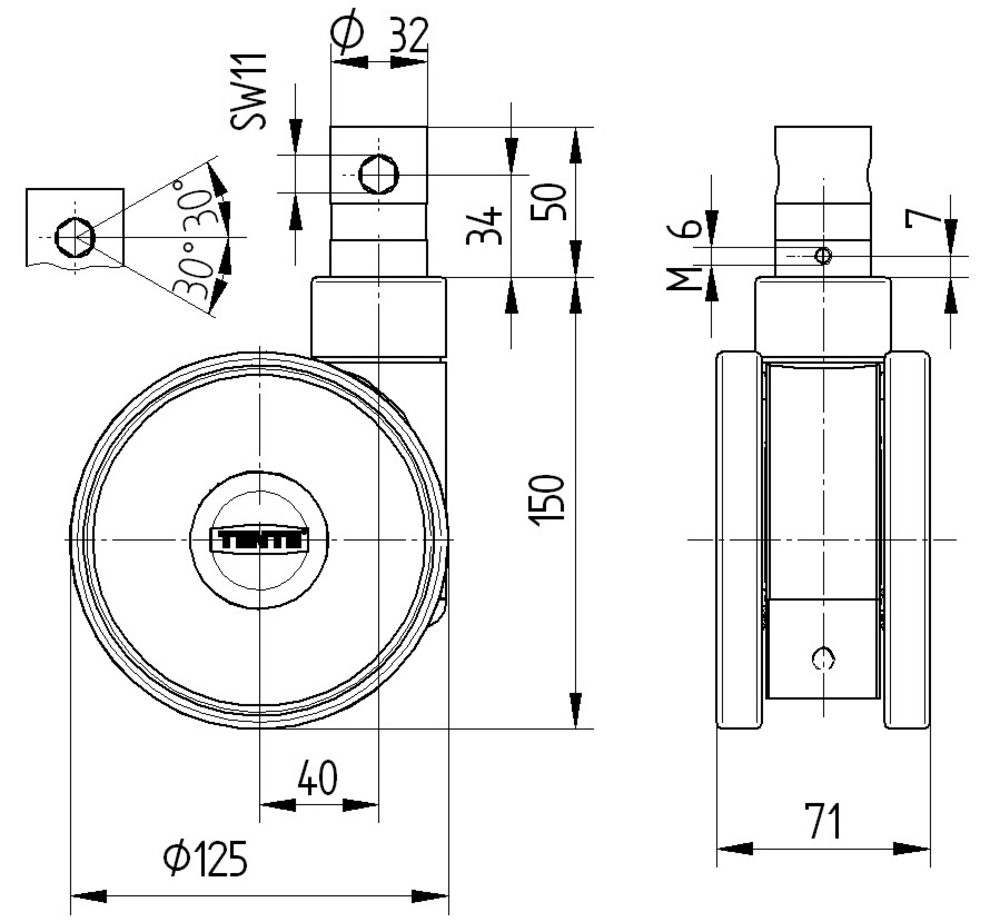 The Linea clinic is a swivel castor with central, total lock designed for medical applications. The fitting features a stem with cam hole for profile bars in short version configuration, with the critical requirement that washable beds must be sealed in the fitting area by the hospital bed manufacturer to maintain hygiene standards. The housing is constructed from polyamide material and incorporates a precision ball bearing swivel mechanism for smooth directional changes. The wheel assembly consists of a polyamide body with injected polyurethane tread material, mounted on stainless precision ball bearings for corrosion resistance and longevity. The wheel diameter measures 125 mm, providing optimal manoeuvrability for medical equipment. The overall height dimension is 150 mm, ensuring compatibility with standard hospital bed frames. Load specifications include dynamic capacities of 150 kg at speeds of 3 km/h and 150 kg at 4 km/h, whilst the static load capacity reaches 300 kg, making it suitable for heavy medical equipment and patient transport applications.