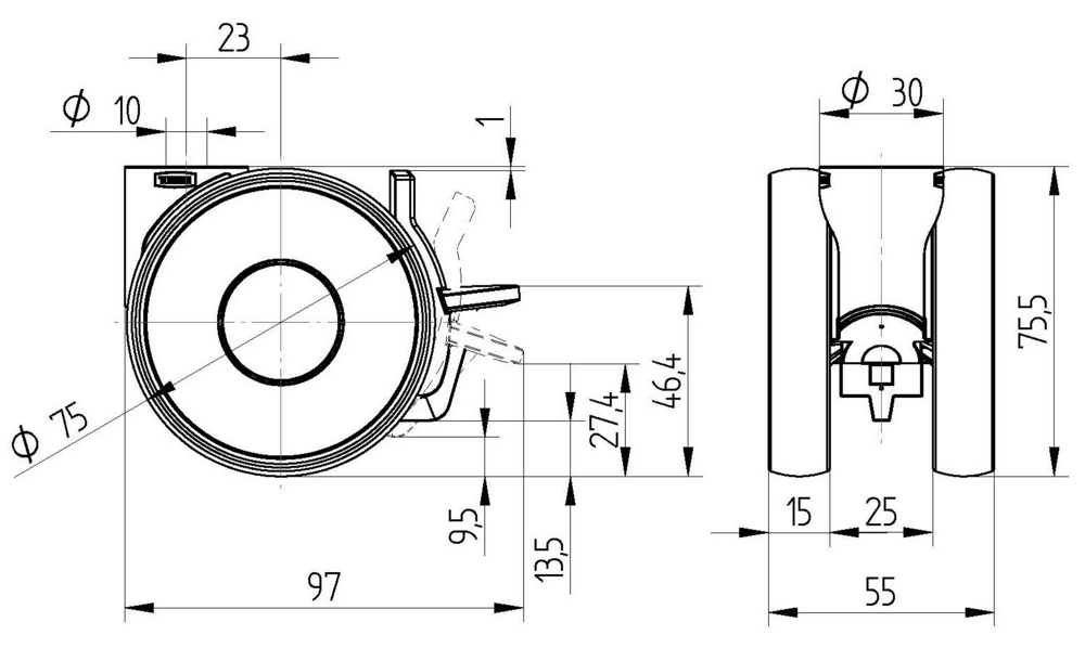 The Linea light swivel castor with wheel brake features a blind hole for b10 fitting fitting and a housing made of polyamide. It has a stem with a swiveling swivel bearing. The wheel body material is polyamide and the tread material is polyurethane, injected. The wheel has a plain bearing. The Linea light swivel castor has a wheel diameter of 75 mm and an overall height of 75.5 mm. It has a load capacity of 90 kg at 3 km/h and a static load capacity of 180 kg.