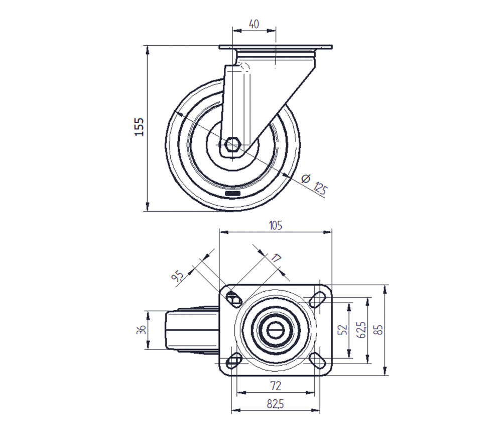 The Alpha swivel castor features a small rectangular plate fitting for secure mounting applications. The housing is constructed from heavy steel sheet and incorporates a robust two ball races swivel bearing system for smooth directional movement. The wheel comprises a polyamide body fitted with an elastic tyre, non-marking, vulcanised tread material, and is equipped with a precision ball bearing for optimal rolling performance. The wheel diameter measures 125 mm, whilst the overall height of the complete assembly is 155 mm. Load specifications include a dynamic capacity of 200 kg at speeds up to 4 km/h and a static load capacity of 400 kg, making this castor suitable for medium to heavy-duty industrial applications requiring reliable mobility and directional control.