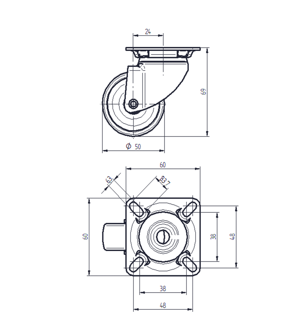 The Agila swivel castor features a square plate fitting for secure mounting applications. The housing is constructed from medium steel sheet and incorporates two ball races for the swivel bearing mechanism, ensuring smooth directional movement and enhanced durability. The wheel comprises a polypropylene body with tread material identical to the wheel body, providing consistent performance characteristics, whilst the plain bearing with spacer tube delivers reliable rotation with minimal maintenance requirements. The wheel diameter measures 50 mm with an overall height of 69 mm, making it suitable for compact installations. Load specifications include a dynamic capacity of 50 kg at 3 km/h operating speed and a static load capacity of 100 kg, making it ideal for care beds, catering carts and meal delivery systems, hospitals, nursing and retirement homes, professional cleaning carts, and store fixtures and display applications.