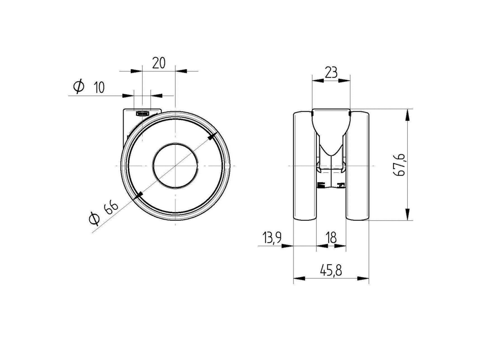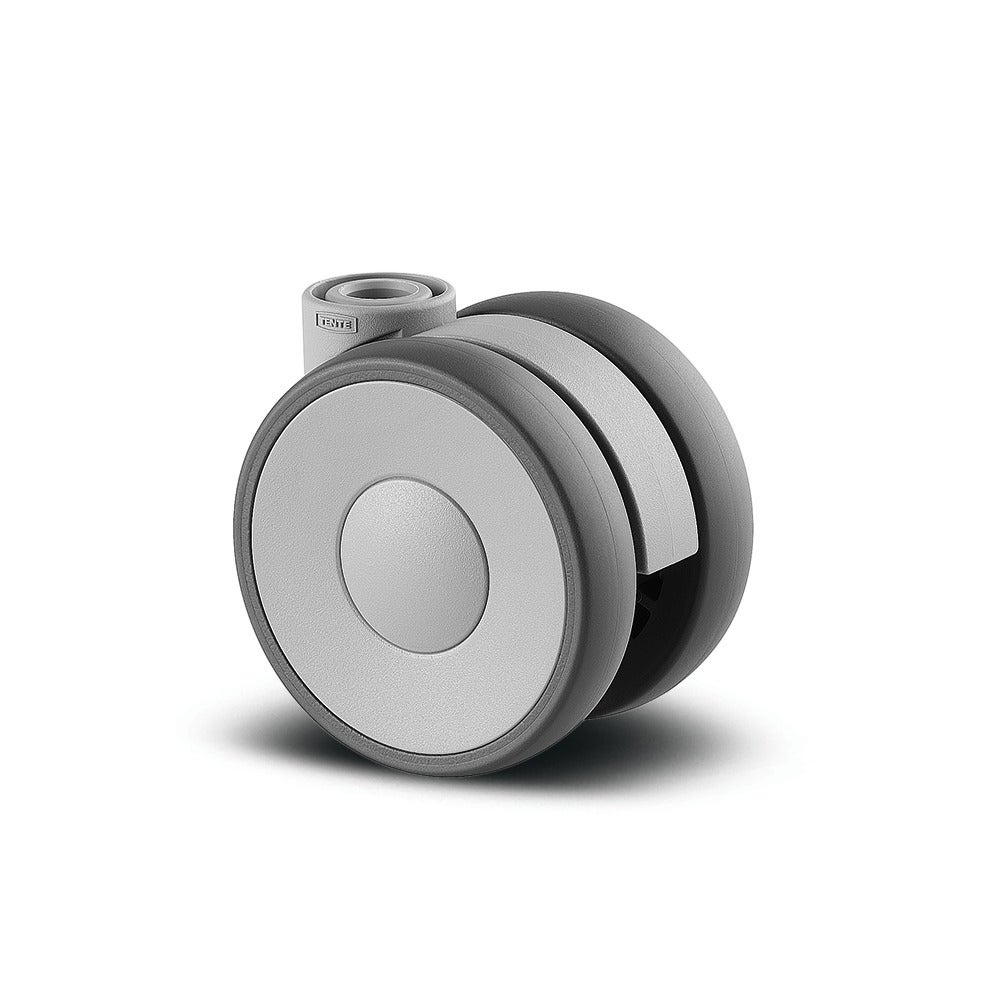 The Linea light swivel castor features a blind hole for B10 fitting system for secure mounting applications. The housing is constructed from durable polyamide material and incorporates a stem, swivelling bearing mechanism that ensures smooth directional changes and reliable operation. The wheel assembly consists of a polyamide body fitted with an injected polyurethane tread that provides excellent floor protection and quiet rolling performance, supported by a plain bearing with spacer tube for consistent rotation. With a wheel diameter of 65 mm, the castor achieves an overall height of 68 mm, making it suitable for compact installations. The unit offers a dynamic load capacity of 60 kg at speeds up to 3 km/h and a static load capacity of 120 kg, making it ideal for medical equipment including anaesthesia carts, bedside tables, C-arms, CT scanners, MRI and X-ray systems, catering carts, computers on wheels, dialysis equipment, office furniture and chairs, ultrasound devices, ventilators, and professional cleaning carts in hospitals and nursing facilities.