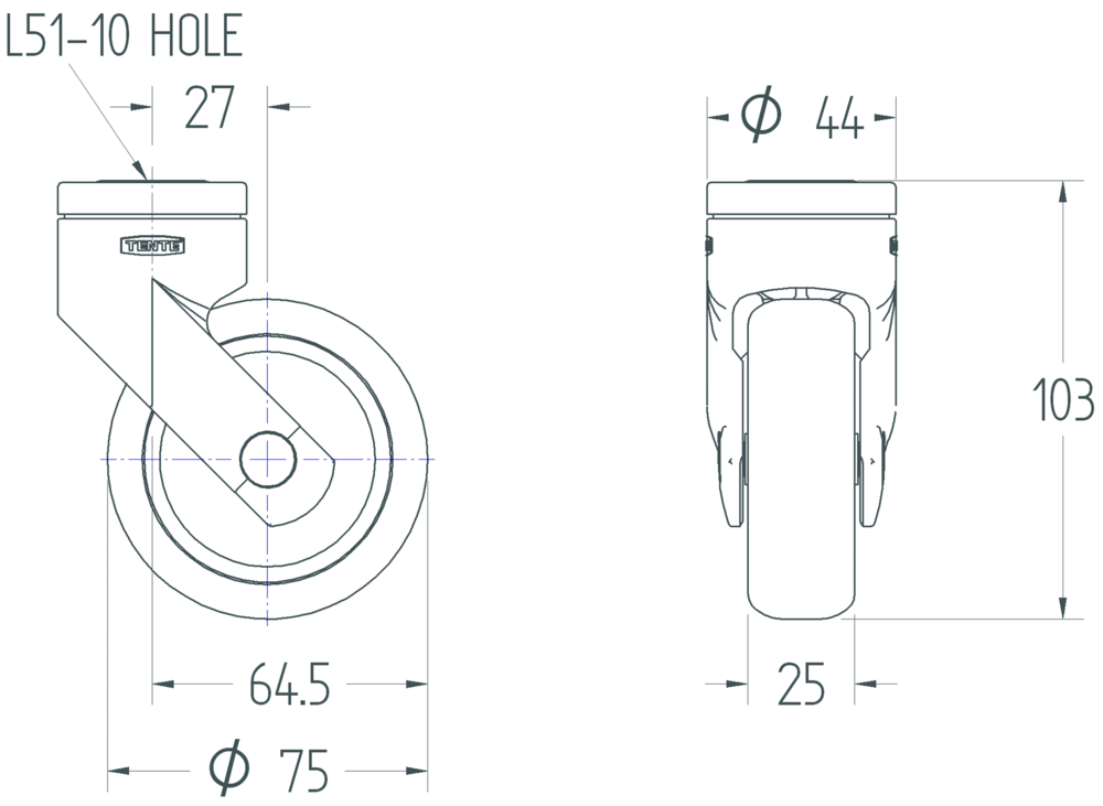 The Levina light swivel castor features a blind hole for B10 fitting system for secure mounting applications. The housing is con...