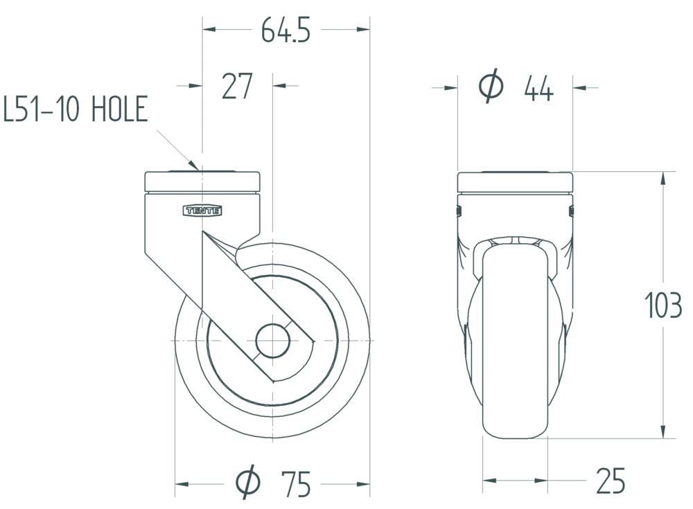 The Levina light swivel castor features a blind hole for B10 fitting system for secure mounting applications. The housing is constructed from durable polyamide material and incorporates a stem, swiveling bearing mechanism that enables smooth directional changes. The wheel assembly consists of a polypropylene body fitted with a thermoplastic rubber tread for optimal floor protection and quiet operation, supported by precision ball bearings for enhanced durability and smooth rolling performance. With a wheel diameter of 75 mm, the castor has an overall height of 103 mm. Load specifications include a dynamic capacity of 75 kg at speeds up to 3 km/h and a static load capacity of 150 kg. This castor is specifically designed for medical and healthcare applications including anaesthesia carts, C-arms, CT scanners, MRI, X-ray equipment, computers on wheels, dialysis carts, medication carts, nursing carts, ultrasound devices, and ventilators.