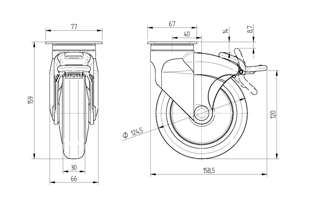 The Galea swivel castor with directional lock features a rectangular plate fitting for secure mounting applications. The housing is constructed from durable polyamide material and incorporates two ball races for the swivel bearing mechanism, ensuring smooth rotational movement and enhanced operational reliability. The wheel assembly comprises a polypropylene body with electric conductive properties, fitted with a thermoplastic rubber tread that maintains electric-conductive characteristics for static discharge applications, whilst utilising a plain bearing system for consistent rolling performance. With a wheel diameter of 125mm, the castor achieves an overall height of 159mm. Load specifications include a dynamic capacity of 100kg at speeds up to 3km/h and a static load capacity of 200kg. This castor is specifically designed for care beds, catering carts and meal delivery systems, and shower chairs where mobility and electrical conductivity are essential requirements.