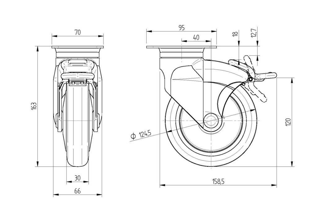 The Galea swivel castor with directional lock features a rectangular plate fitting for secure mounting applications. The housing is constructed from durable polyamide material and incorporates two ball races for the swivel bearing mechanism, ensuring smooth rotational movement and enhanced operational reliability. The wheel assembly comprises a polypropylene body with electric conductive properties, fitted with a thermoplastic rubber tread that maintains electric-conductive characteristics for static discharge applications, whilst utilising a plain bearing system for consistent rolling performance. The wheel diameter measures 125mm, contributing to an overall height of 163mm for the complete castor assembly. Load specifications include a dynamic capacity of 100kg at speeds up to 3km/h and a static load capacity of 200kg, making it suitable for demanding applications including care beds, catering carts and meal delivery systems, and shower chairs.