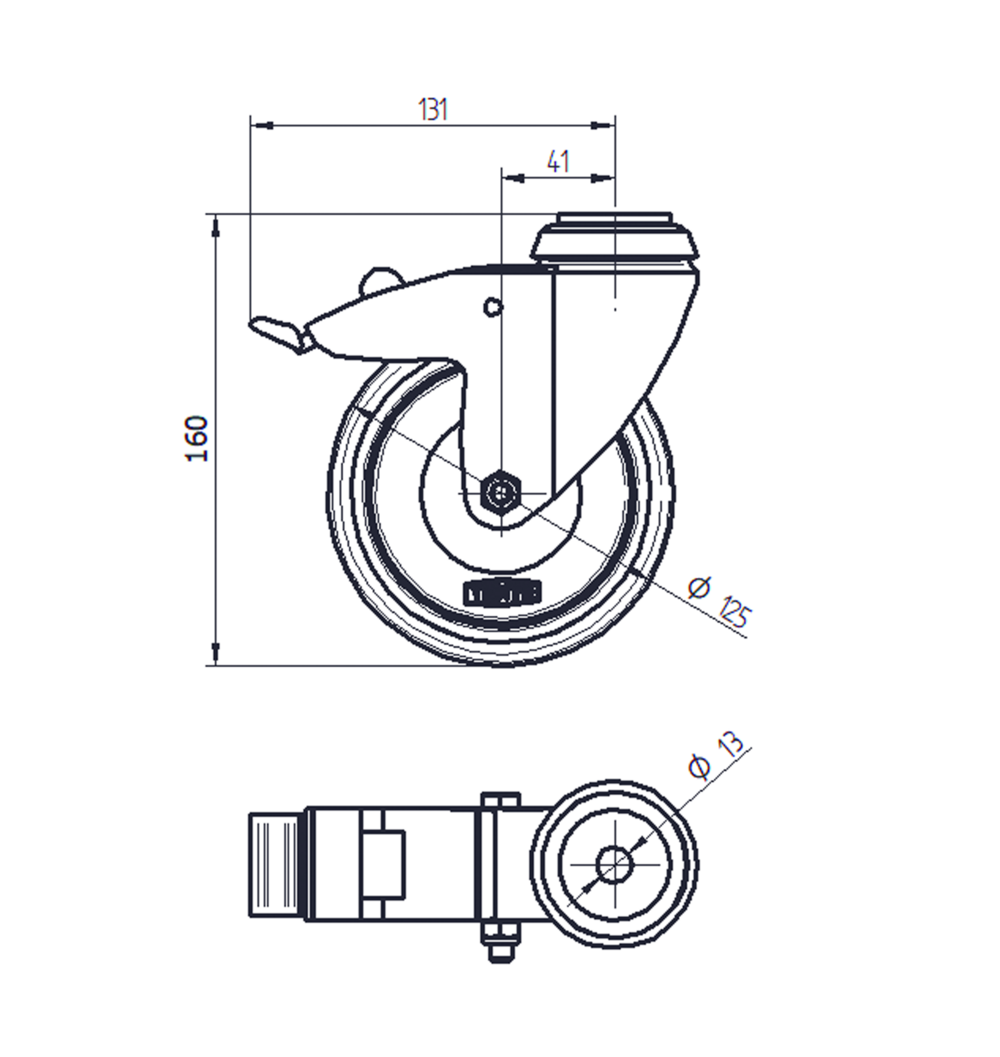 Swivel castor with total lock 125 mm
