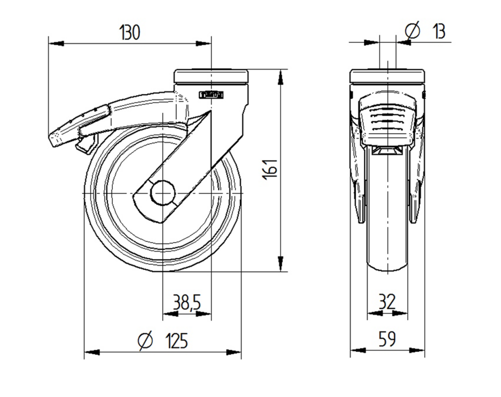 Swivel castor with total lock 125 mm