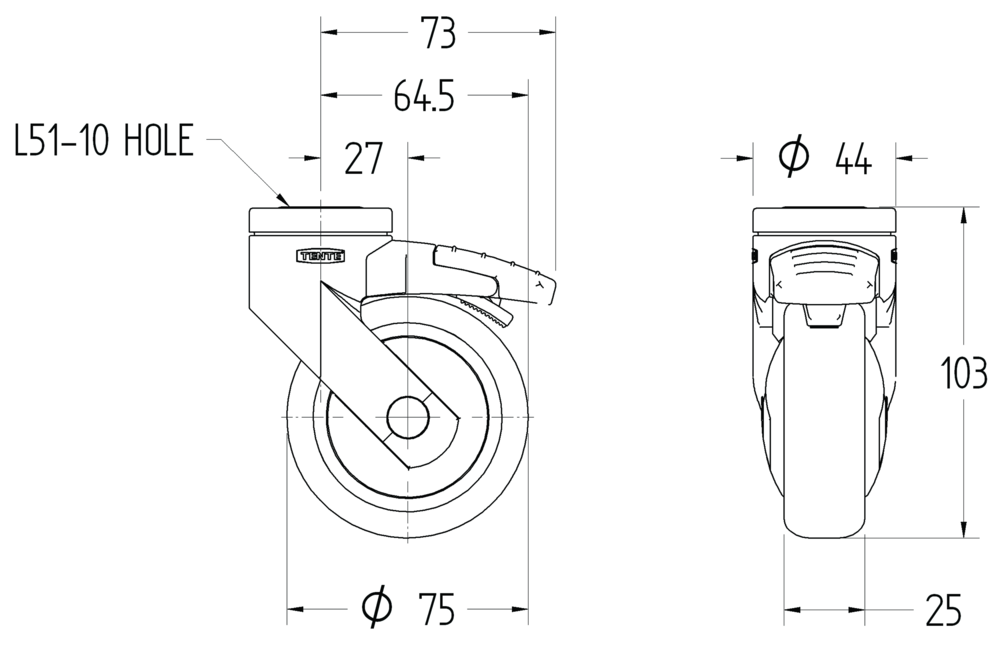 The Levina light swivel castor with wheel brake features a blind hole for B10 fitting system for secure mounting applications. T...